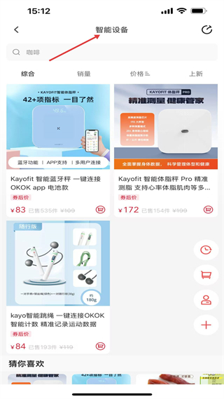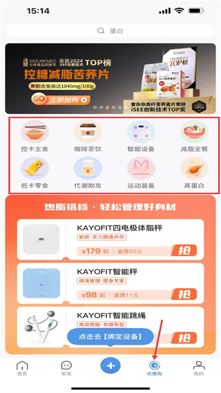 1、優(yōu)惠購板塊,有控卡主食等分類,展示體脂秤等優(yōu)惠商品,用戶可選購減肥相關(guān)用品。