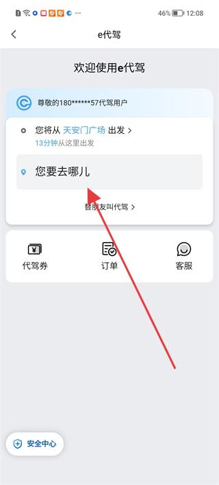 2、進(jìn)入e代駕頁面,在您要去哪兒輸入框中輸入目的地,可發(fā)起代駕訂單,享受代駕服務(wù)。