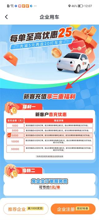 1、進(jìn)入軟件企業(yè)用車頁面,查看每單至高優(yōu)惠25等新客充值三重福利,了解企業(yè)用車優(yōu)惠活動。