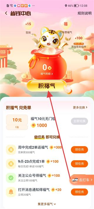 4、進(jìn)入省錢中心頁面點擊積福氣,完成簽到、做任務(wù)等操作,積累福氣可兌換優(yōu)惠福利,節(jié)省出行成本。