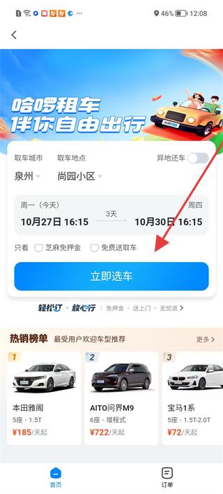 3、進(jìn)入哈啰租車頁面,選擇取車城市、地點和時間后,點擊立即選車,可選擇心儀車型進(jìn)行租賃。