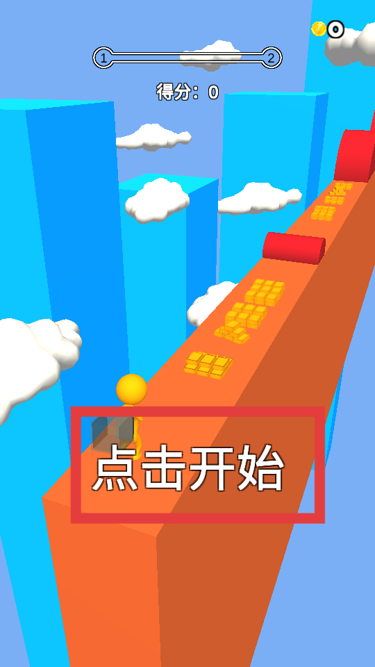 1、點擊開始,操控黃顏色小人在橙色通道上前行,通道上有金條等物品,收集它們能獲得分數(shù),同時注意躲避紅色滾筒等障礙。