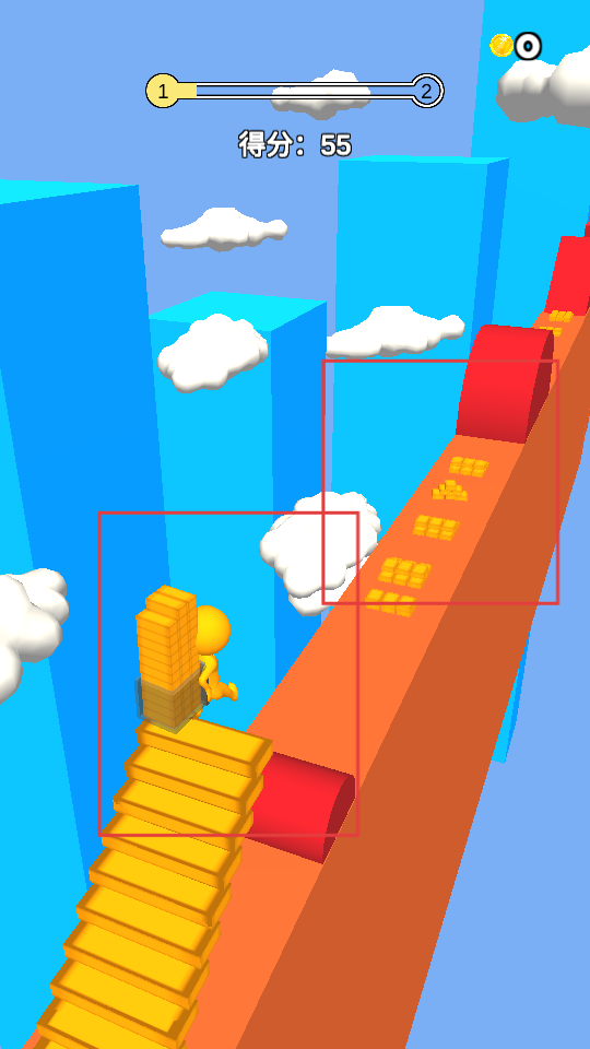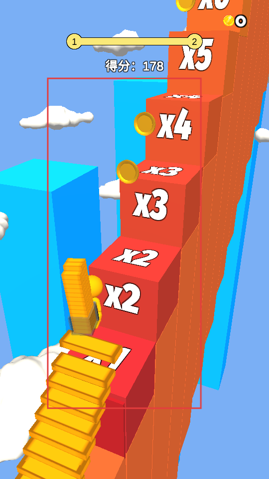 3、遇到帶有倍數(shù)標識的紅色方塊,讓小人接觸這些方塊,能使分數(shù)倍數(shù)增加,快速提升得分,同時還能收集金幣等獎勵。