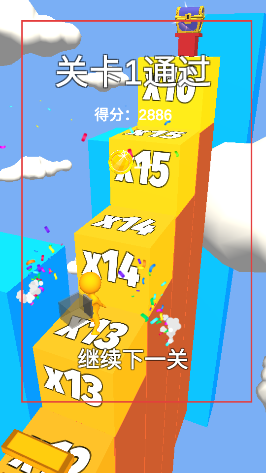 4、當屏幕顯示關卡1通過,說明成功完成當前關卡,此時可選擇繼續(xù)下一關,挑戰(zhàn)更難的關卡,爭取獲得更高分數(shù)和更多獎勵。