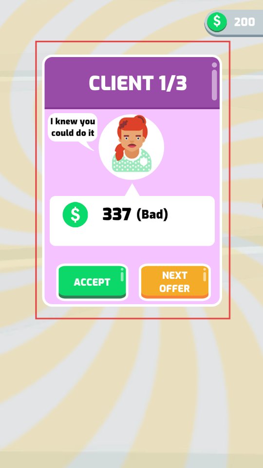 4、作品完成后,會(huì)出現(xiàn)結(jié)算界面,顯示客戶評(píng)價(jià)和金幣獎(jiǎng)勵(lì),可選擇ACCEPT接受獎(jiǎng)勵(lì),或NEXT OFFER尋找下一個(gè)創(chuàng)作任務(wù)。