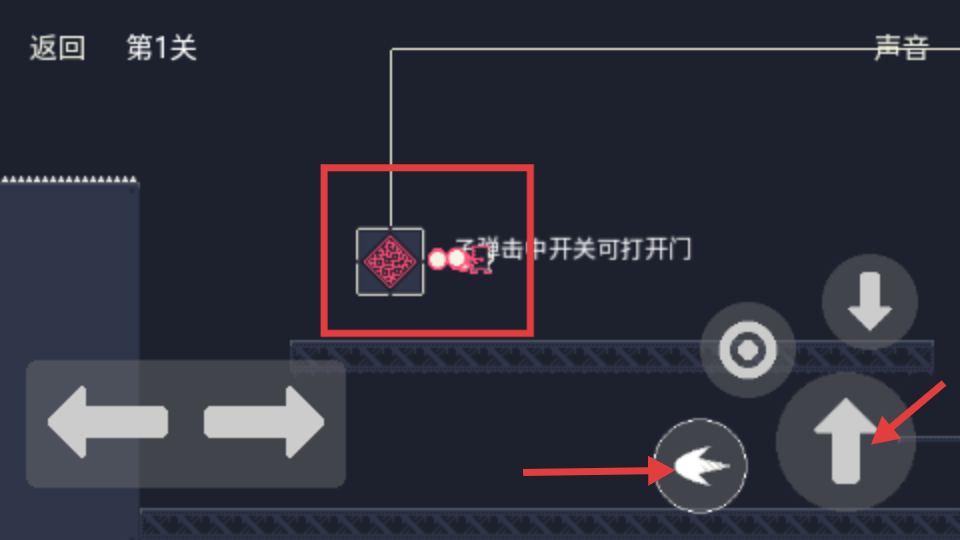 2、遇到開關(guān)時根據(jù)提示,需用子彈擊中它來打開門,點擊攻擊按鈕發(fā)射子彈,瞄準(zhǔn)開關(guān)成功擊中后門會開啟,可繼續(xù)向關(guān)卡深處前進。