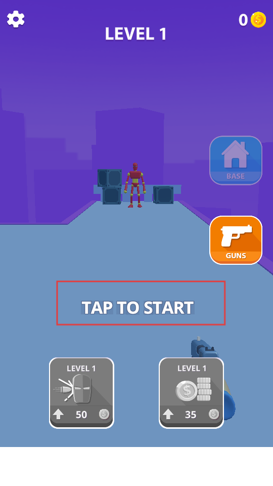 1、進(jìn)入游戲第一關(guān)界面,點(diǎn)擊TAP TO START開始游戲,可看到有機(jī)器人敵人,還有BASE、GUNS等功能按鈕,后續(xù)可探索使用。