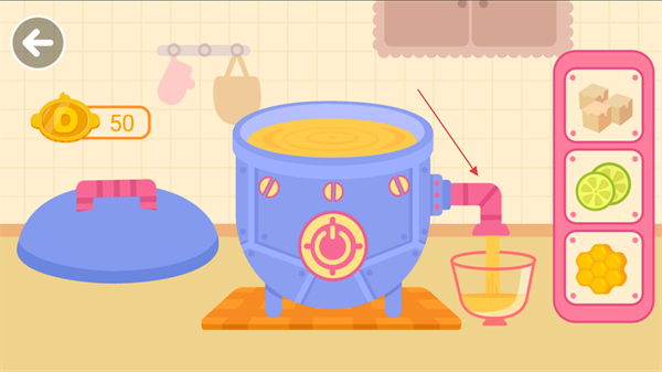 2、在糖果制作界面,屏幕右側(cè)有各種制作糖果的材料,如塊狀原料、檸檬片、糖塊等,點擊選擇材料將其添加到煮鍋。
