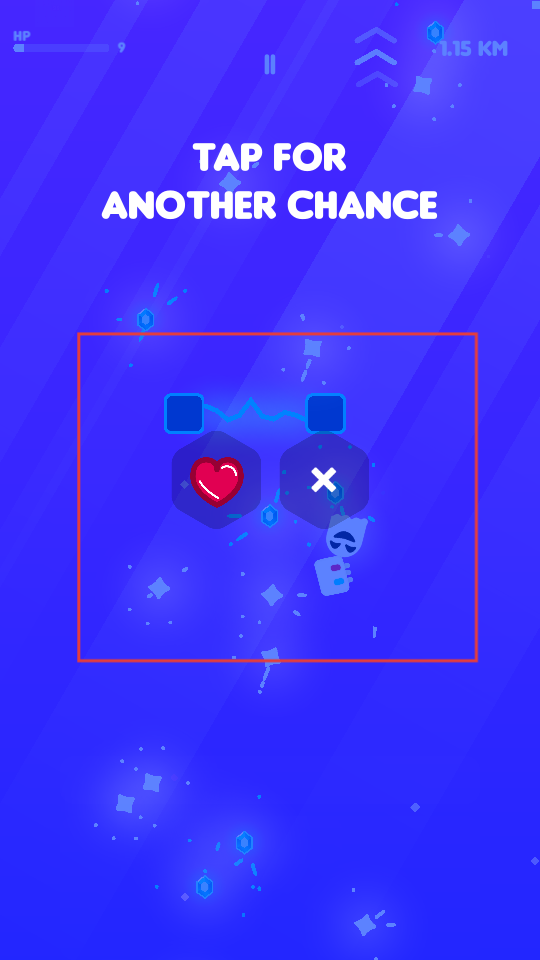 4、若角色HP耗盡,游戲結(jié)束,界面會顯示TAP FOR ANOTHER CHANCE,可選擇愛心圖標(biāo)獲得再一次機(jī)會,繼續(xù)冒險(xiǎn)。