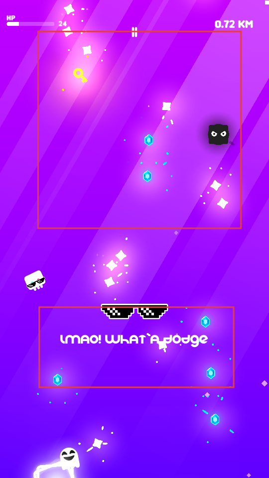 3、遇到黑色敵人等障礙時(shí),靈活躲避,成功躲避后會有LMAO WHAT A DODGE的提示,繼續(xù)收集物品,推進(jìn)距離。