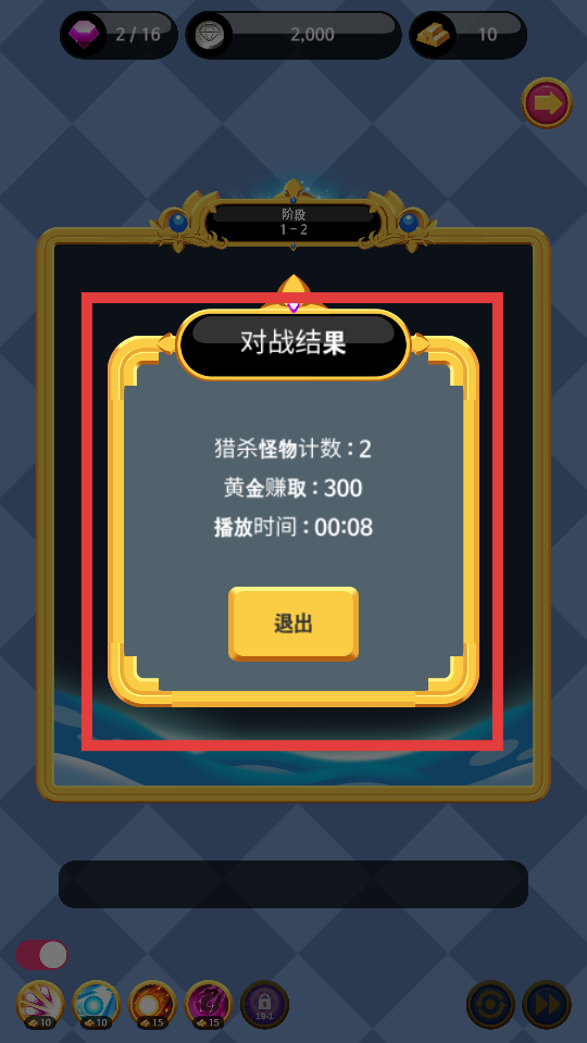 4、對戰(zhàn)結束后,會顯示獵殺怪物計數(shù)、黃金賺取和播放時間等對戰(zhàn)結果,點擊退出可結束對戰(zhàn),返回主界面或進行其他操作。