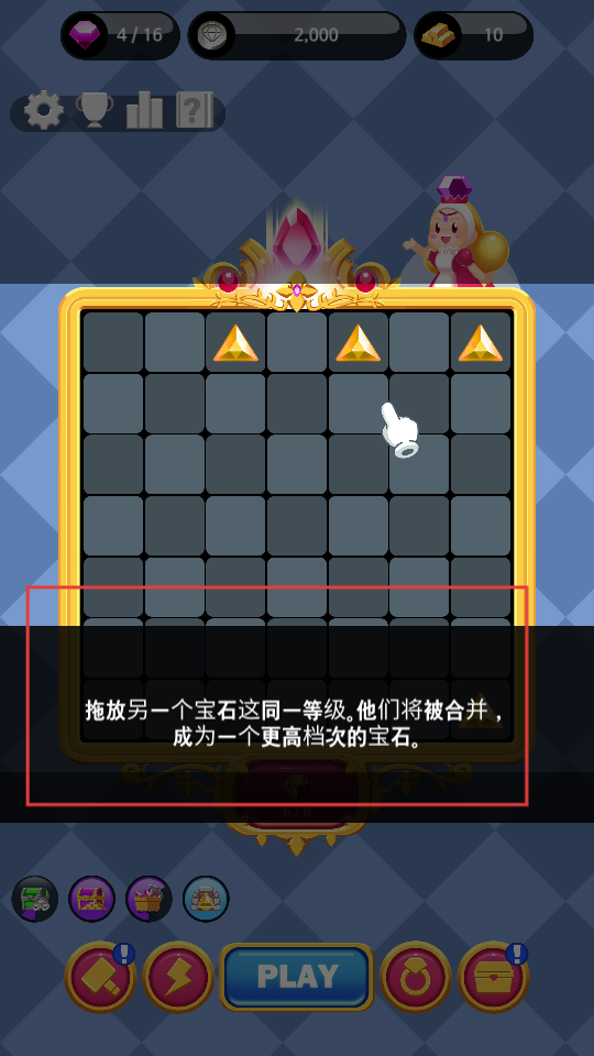 1、進入游戲界面,按照提示拖放同等級寶石,使其合并成更高檔次的寶石,不斷合成提升寶石等級,為后續(xù)挑戰(zhàn)做準備。