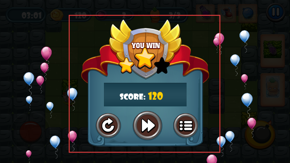 3、成功完成關(guān)卡目標(biāo)后,會(huì)顯示勝利提示,展示得分等信息,之后可選擇重新開(kāi)始、進(jìn)入下一關(guān)或查看關(guān)卡列表。