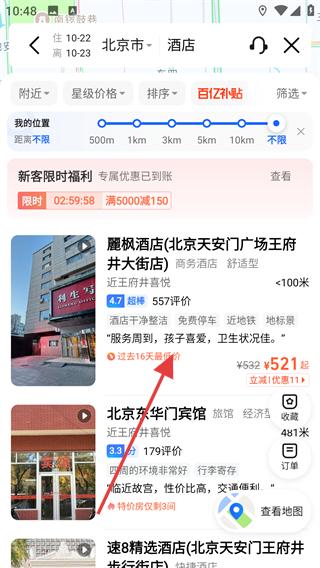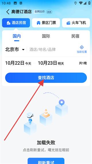 1、打開高德地圖APP,進(jìn)入訂酒店頁面,選擇城市為北京市,設(shè)置入住和退房日期,點(diǎn)擊查找酒店,瀏覽附近酒店列表。