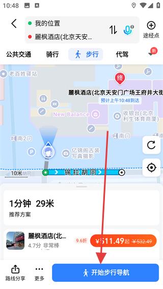 4、確認(rèn)路線后點(diǎn)擊開始步行導(dǎo)航,按照導(dǎo)航提示前往酒店,途中可查看實(shí)時(shí)位置和剩余距離,順利到達(dá)酒店。