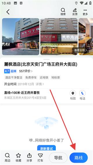 3、在酒店詳情頁點(diǎn)擊路線,進(jìn)入導(dǎo)航頁面,選擇步行導(dǎo)航方式,查看步行路線和預(yù)計(jì)時(shí)間。