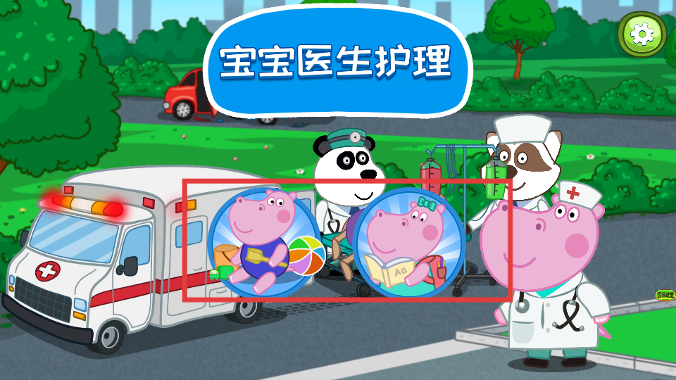 1、進入游戲首先會看到帶有救護車、卡通角色的界面,還有不同的游戲模式選項,點擊選擇想要體驗的模式,即可開啟相應的醫(yī)生護理游戲內容。