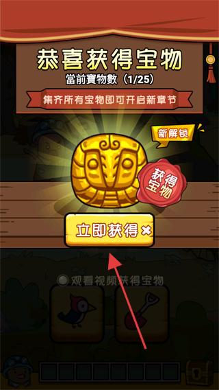 3、成功獲取寶物后會(huì)出現(xiàn)恭喜獲得寶物的提示界面,點(diǎn)擊立即獲得按鈕,領(lǐng)取寶物,積累寶物數(shù)量,推進(jìn)探險(xiǎn)進(jìn)程。