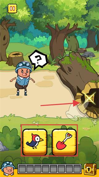2、在探險(xiǎn)場景中遇到帶有問號(hào)的樹樁等物體時(shí),根據(jù)下方的道具提示,選擇合適的道具,點(diǎn)擊道具對物體進(jìn)行操作,嘗試獲取寶物。