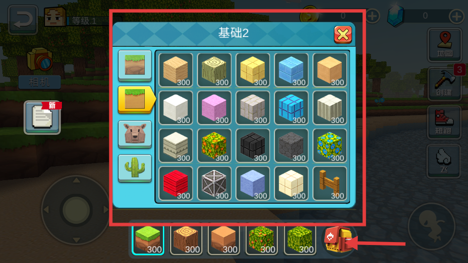 2、游戲里有豐富的方塊種類,點(diǎn)擊下方的方塊選擇界面,能看到更多不同顏色、材質(zhì)的方塊,選擇這些方塊可以拓展建造的樣式和內(nèi)容。
