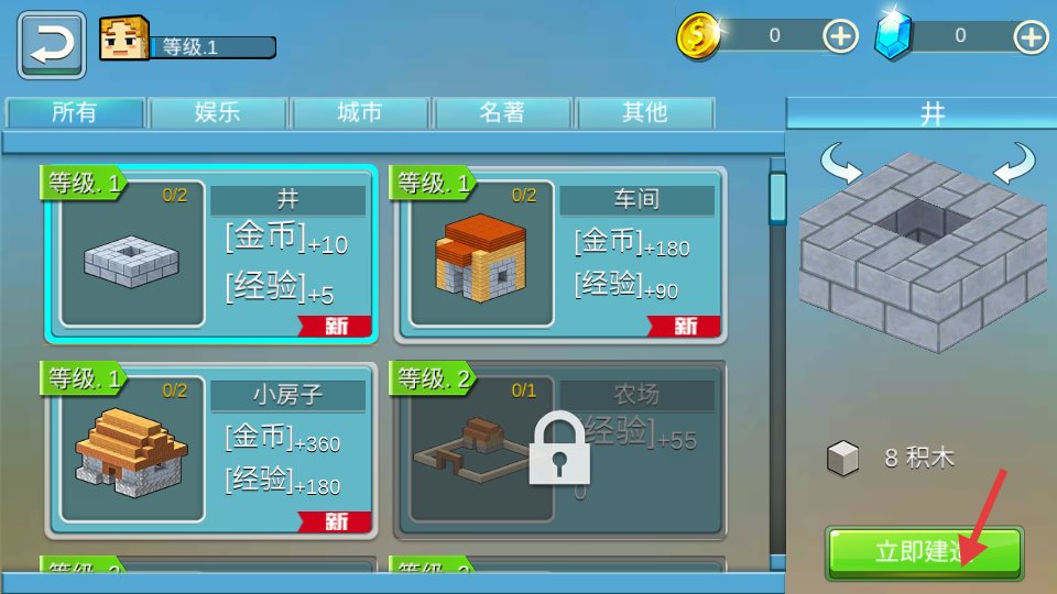 3、建筑建造界面有不同的建筑選項(xiàng),每個(gè)建筑都有對(duì)應(yīng)的等級(jí)、所需材料以及建造后能獲得的金幣和經(jīng)驗(yàn)獎(jiǎng)勵(lì),選擇想要建造的建筑點(diǎn)擊立即建造。