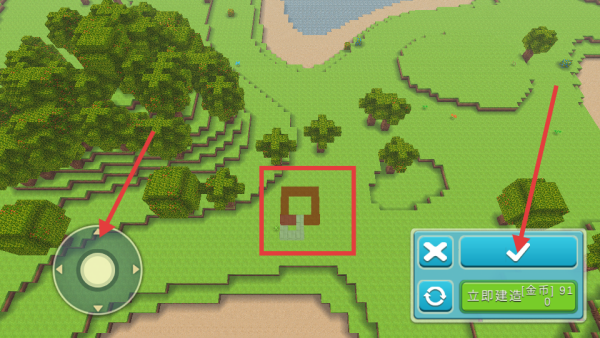 4、當(dāng)選擇好要建造的建筑后,會(huì)進(jìn)入場(chǎng)景布置階段,可以通過左側(cè)的虛擬搖桿調(diào)整視角和建筑的位置,找到合適的放置地點(diǎn),確定位置后點(diǎn)擊對(duì)勾按鈕確認(rèn)建筑的建造。