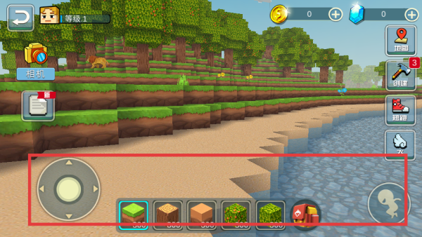 1、首通過左下角的虛擬搖桿控制角色移動(dòng)探索沙盒世界,界面下方有各種基礎(chǔ)方塊,點(diǎn)擊選擇對(duì)應(yīng)的方塊,就可以在場(chǎng)景中進(jìn)行基礎(chǔ)的建造。