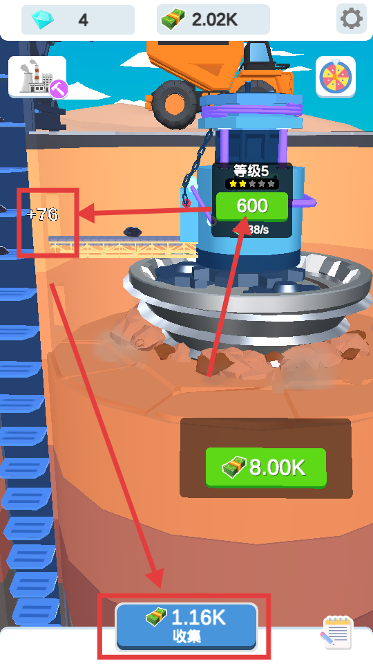 2、點(diǎn)擊設(shè)備上的升級(jí)按鈕,消耗相應(yīng)資源提升設(shè)備等級(jí),等級(jí)提升后設(shè)備的挖掘效率會(huì)提高,能更快地獲取資源,通過收集按鈕可將挖掘出的資源收集起來(lái)。