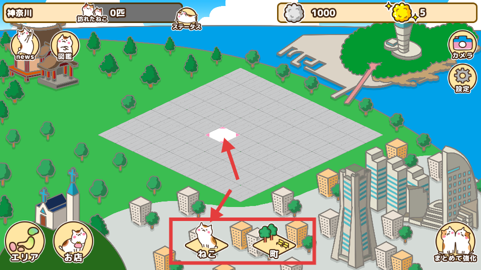 1、游戲開局在神奈川的空地場景中,可從下方選擇貓或町相關(guān)元素,放置到中間的空白方格區(qū)域,通過合理放置這些元素,為后續(xù)吸引貓咪、建設(shè)貓町奠定基礎(chǔ)。