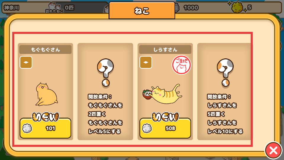2、進(jìn)入貓咪選擇界面,能看到不同種類的貓咪,每種貓咪有特定解鎖條件,有的貓咪解鎖需要放置一定數(shù)量同類型貓咪或提升等級等條件,收集多樣貓咪能豐富貓町內(nèi)容。