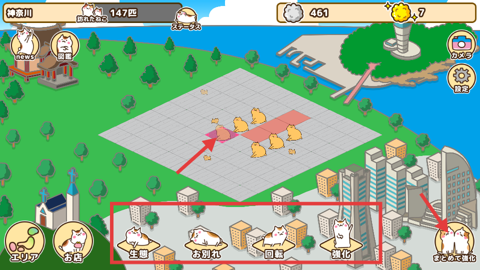3、當(dāng)貓町有一定貓咪后,下方會出現(xiàn)生態(tài)、告別、旋轉(zhuǎn)、強(qiáng)化等功能按鈕,利用這些功能可管理貓咪生態(tài)環(huán)境、調(diào)整貓咪布局。