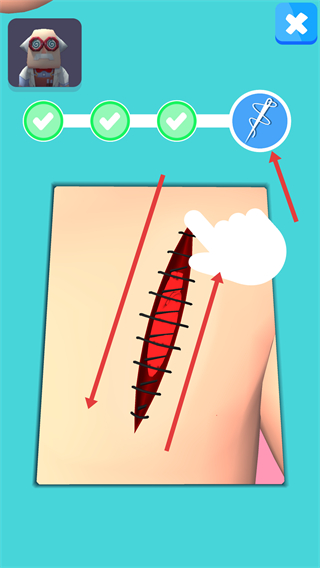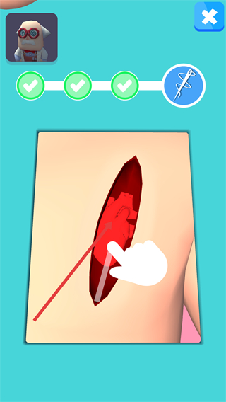 3、對手術部位內部的器官等進行操作,根據提示,用手指點擊或移動,完成關鍵的手術步驟。