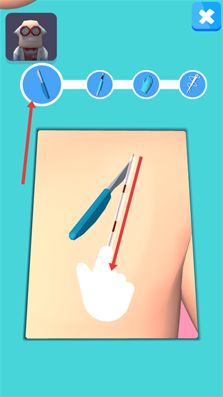 1、先選擇手術刀具,按照提示,用刀具在指定位置進行切割操作,開啟手術的第一步。