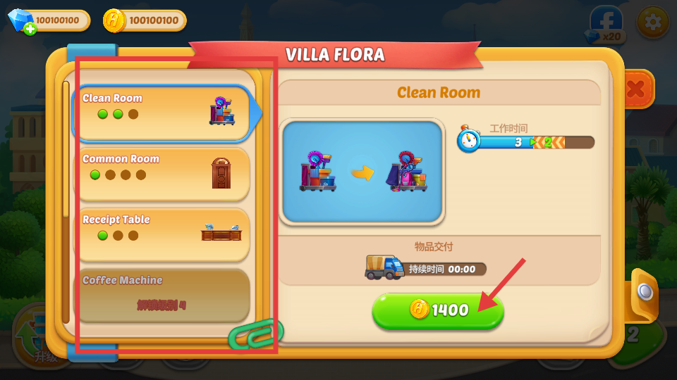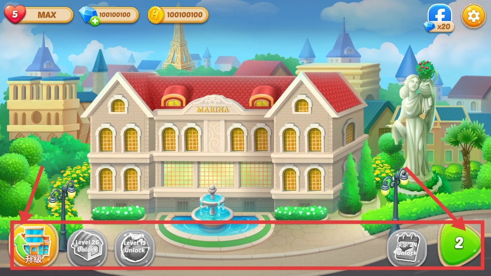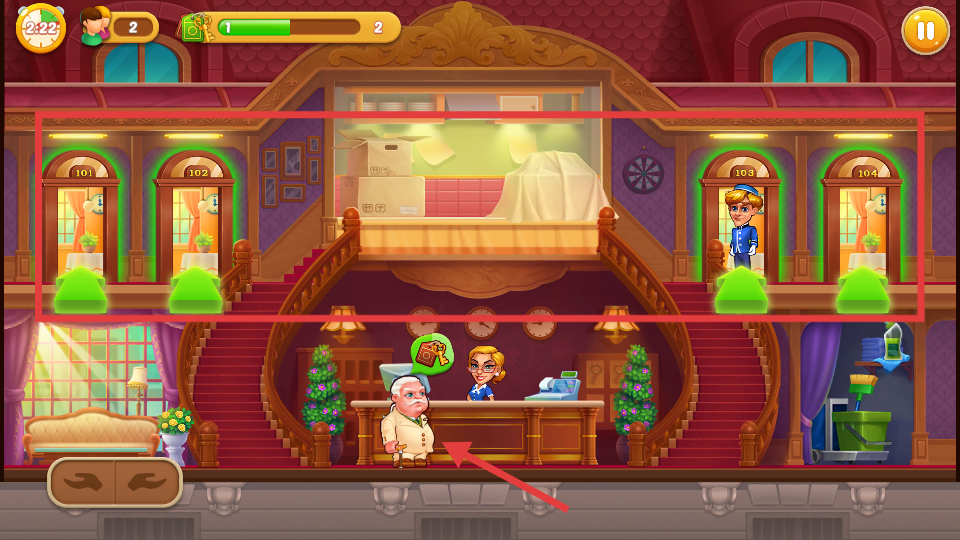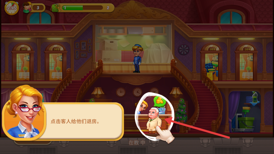 1、首先酒店主界面可看到升級按鈕和標有數(shù)字的按鈕等,點擊升級按鈕能對酒店建筑進行升級,點擊數(shù)字按鈕可選擇進入對應(yīng)的酒店區(qū)域或開啟相關(guān)任務(wù)。