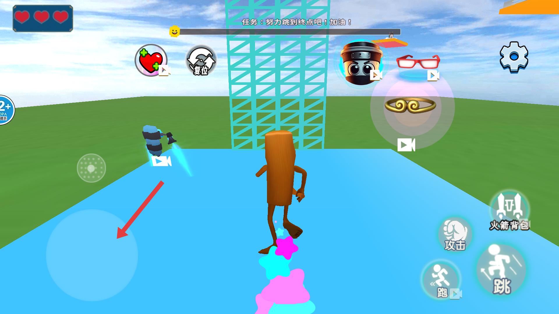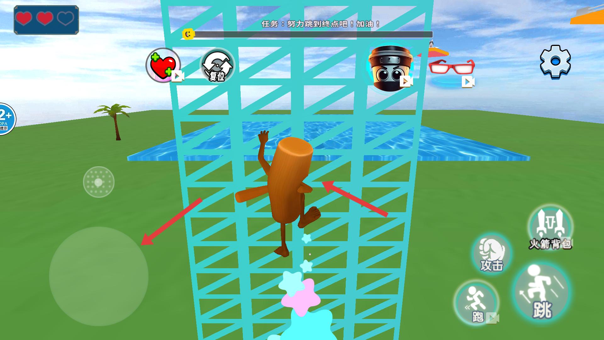 3、遇到網(wǎng)格狀障礙物時,利用右側(cè)【跳】按鈕,讓角色向上跳躍,借助障礙物的網(wǎng)格結(jié)構(gòu),逐步攀爬,向終點推進(jìn)。