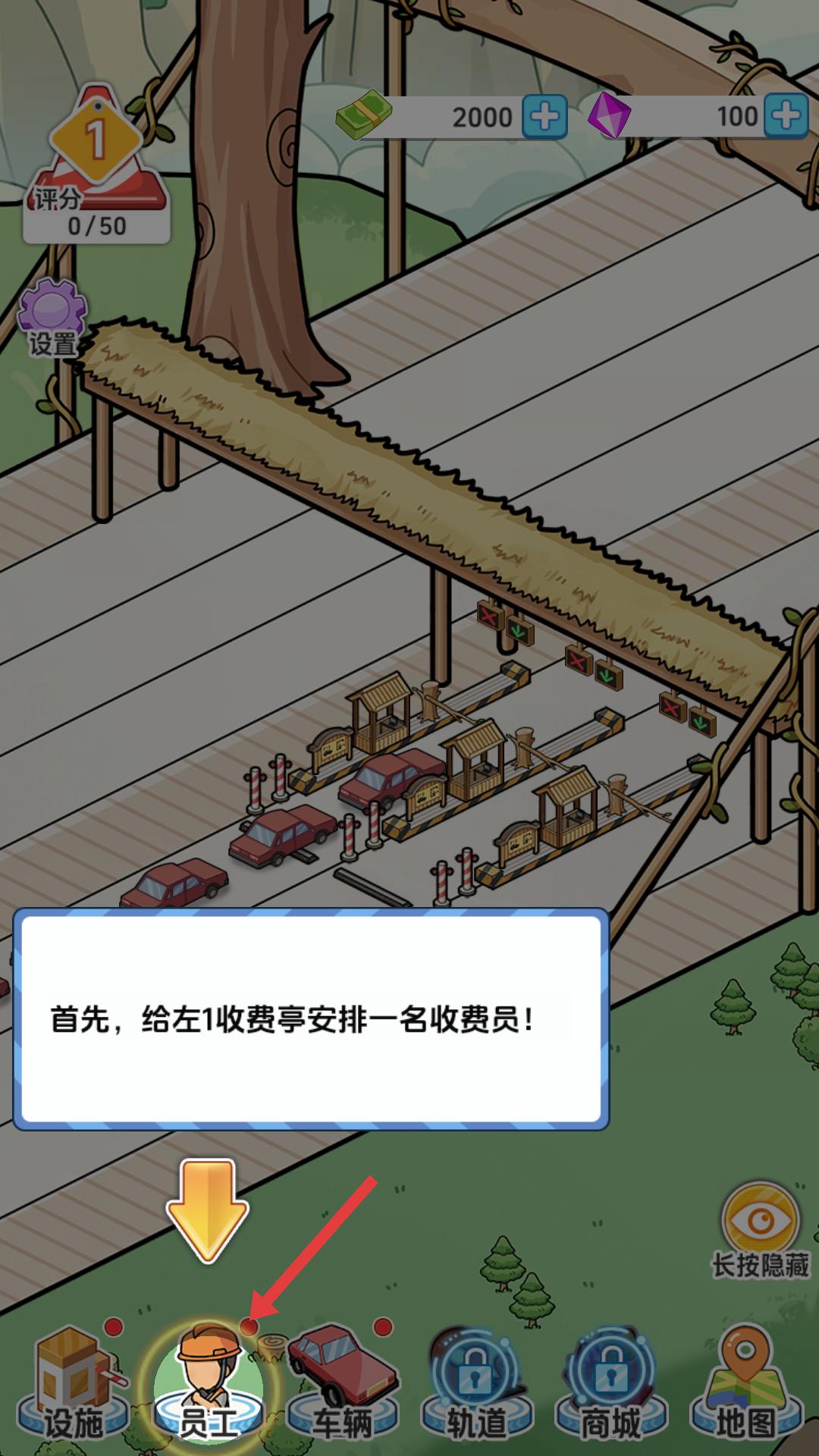 1、游戲開始時(shí),根據(jù)提示點(diǎn)擊員工按鈕,進(jìn)入員工界面,準(zhǔn)備為左1收費(fèi)亭安排收費(fèi)員,這是開啟收費(fèi)業(yè)務(wù)的第一步。