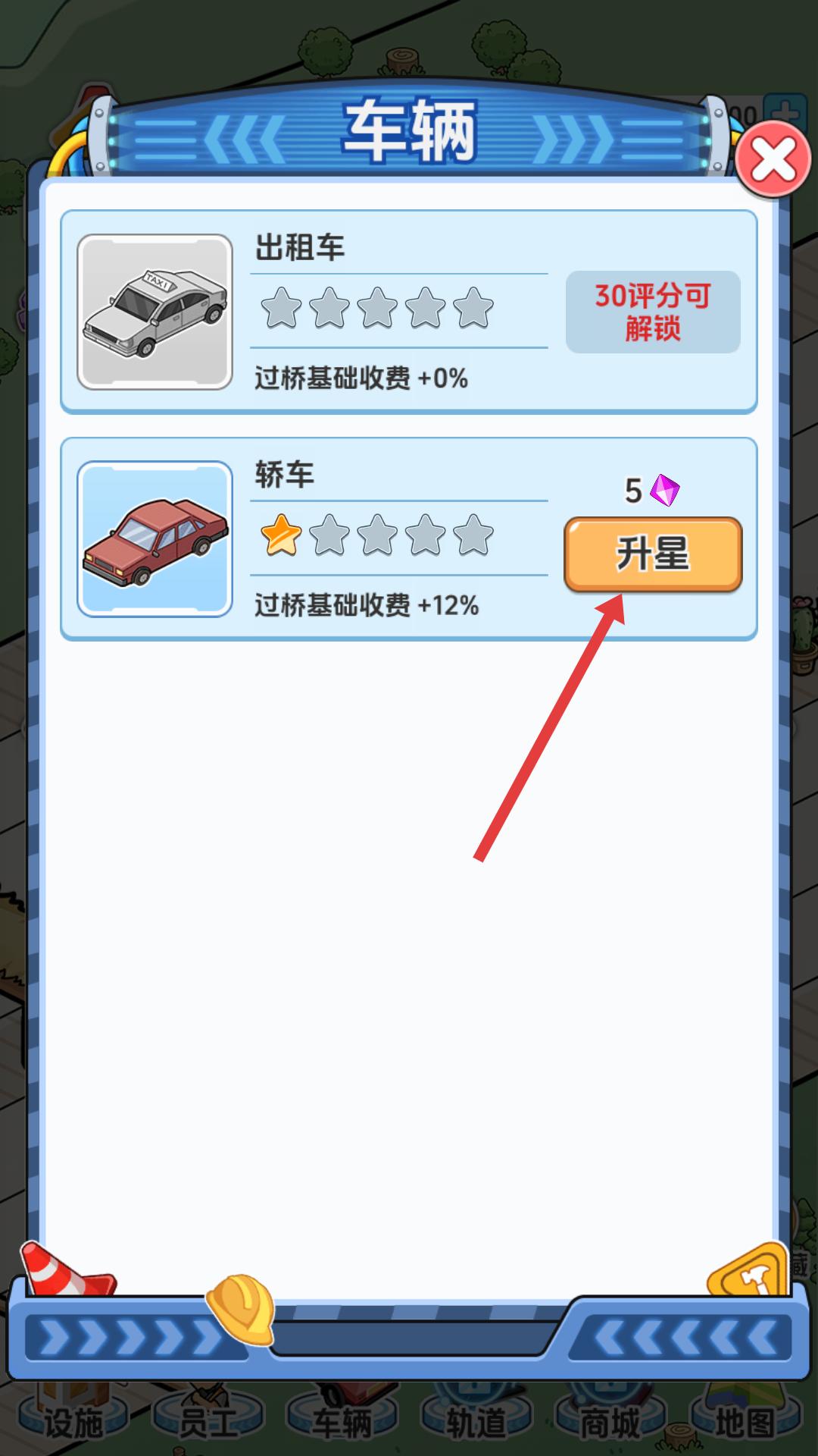 4、在車輛界面,對(duì)于已解鎖的車輛,如轎車,點(diǎn)擊升星按鈕,消耗相應(yīng)道具提升車輛星級(jí),能增加過橋基礎(chǔ)收費(fèi),提升收益。