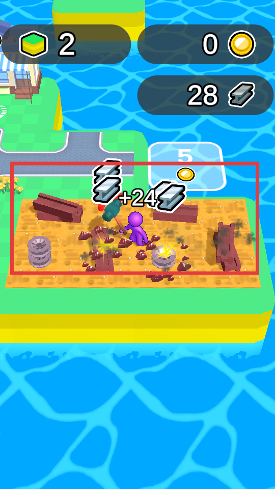 2、接著當(dāng)角色移動(dòng)到有木材、金屬等資源的區(qū)域時(shí)可進(jìn)行采集,像圖中紫色小人用錘子敲擊,能獲取金屬等材料,這些材料是后續(xù)建造、交易的重要資源。