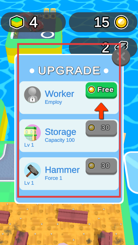 4、最后積累足夠資源后,可進(jìn)入升級(jí)界面,這里能升級(jí)工人、倉(cāng)庫(kù)、錘子等,讓后續(xù)的資源采集、島嶼建設(shè)更高效,推動(dòng)玩家游戲進(jìn)程。