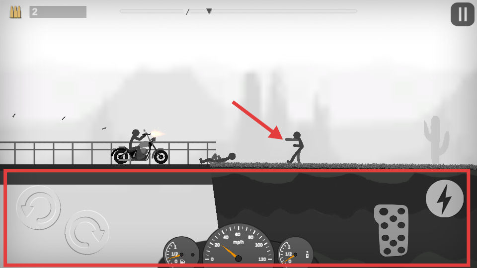 3、駕駛摩托車時利用左側(cè)的控制按鈕調(diào)整方向,遇到敵人可射擊,同時右側(cè)的加速按鈕能在必要時快速提速。