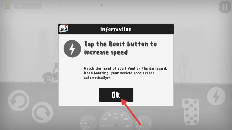 2、游戲中點(diǎn)擊加速按鈕能提升速度,不過要留意儀表盤上的加速燃料余量,加速時車輛會自動加速。