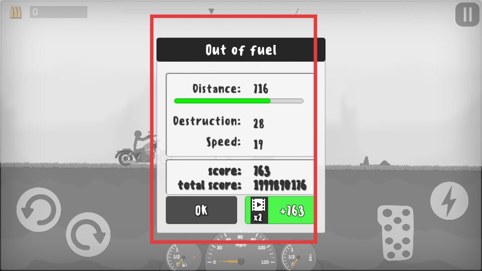 4、若燃料耗盡游戲會結(jié)束并顯示行駛距離、破壞數(shù)、速度等數(shù)據(jù),此時可點(diǎn)擊OK重新開始,或看視頻獲取額外分?jǐn)?shù)。