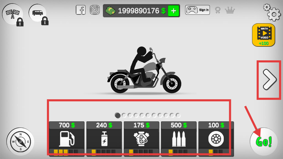 1、進(jìn)入游戲前可花費(fèi)金錢升級摩托車的燃料、加速、引擎、彈藥、輪胎等部件,提升性能后點(diǎn)擊Go開始游戲。