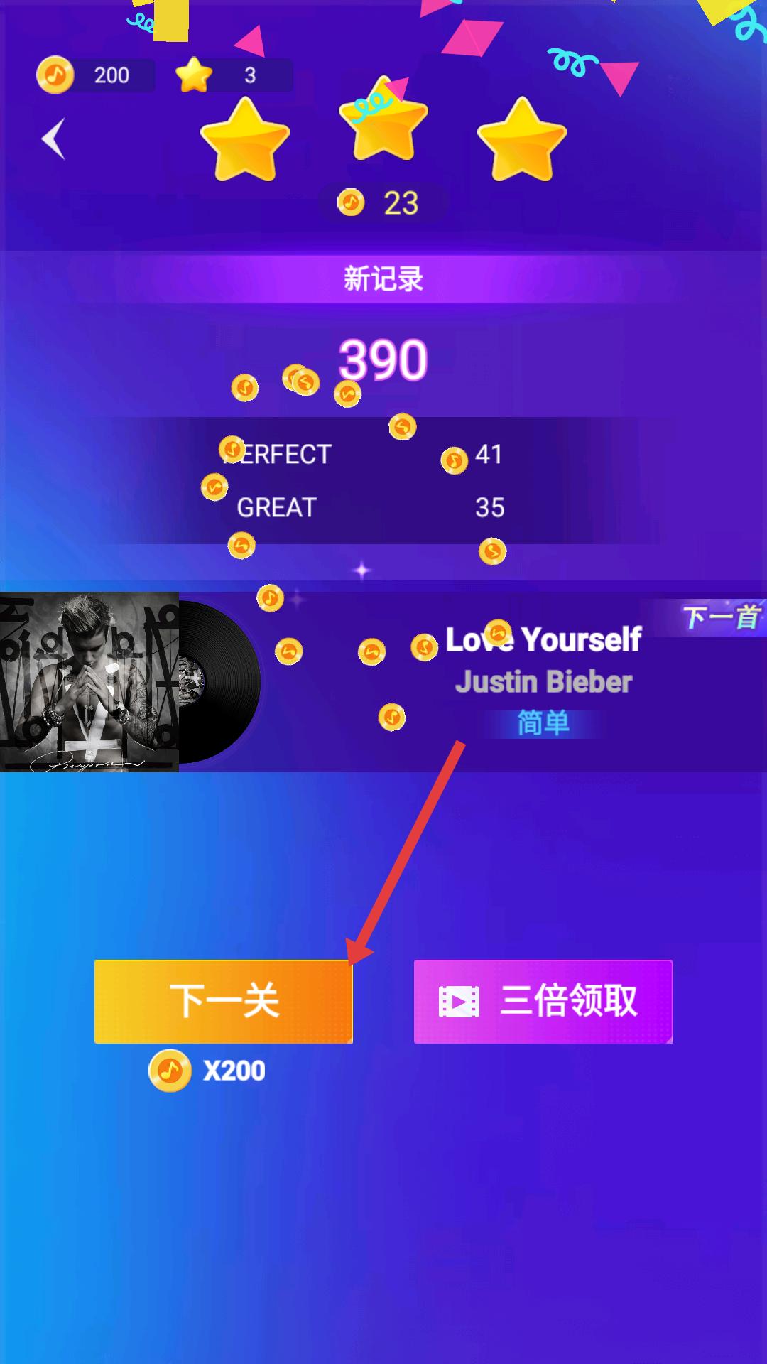 4、演奏結(jié)束界面會展示星星數(shù)、分?jǐn)?shù)等,想繼續(xù)挑戰(zhàn),點【下一關(guān)】按鈕,可進入下一首歌曲演奏。