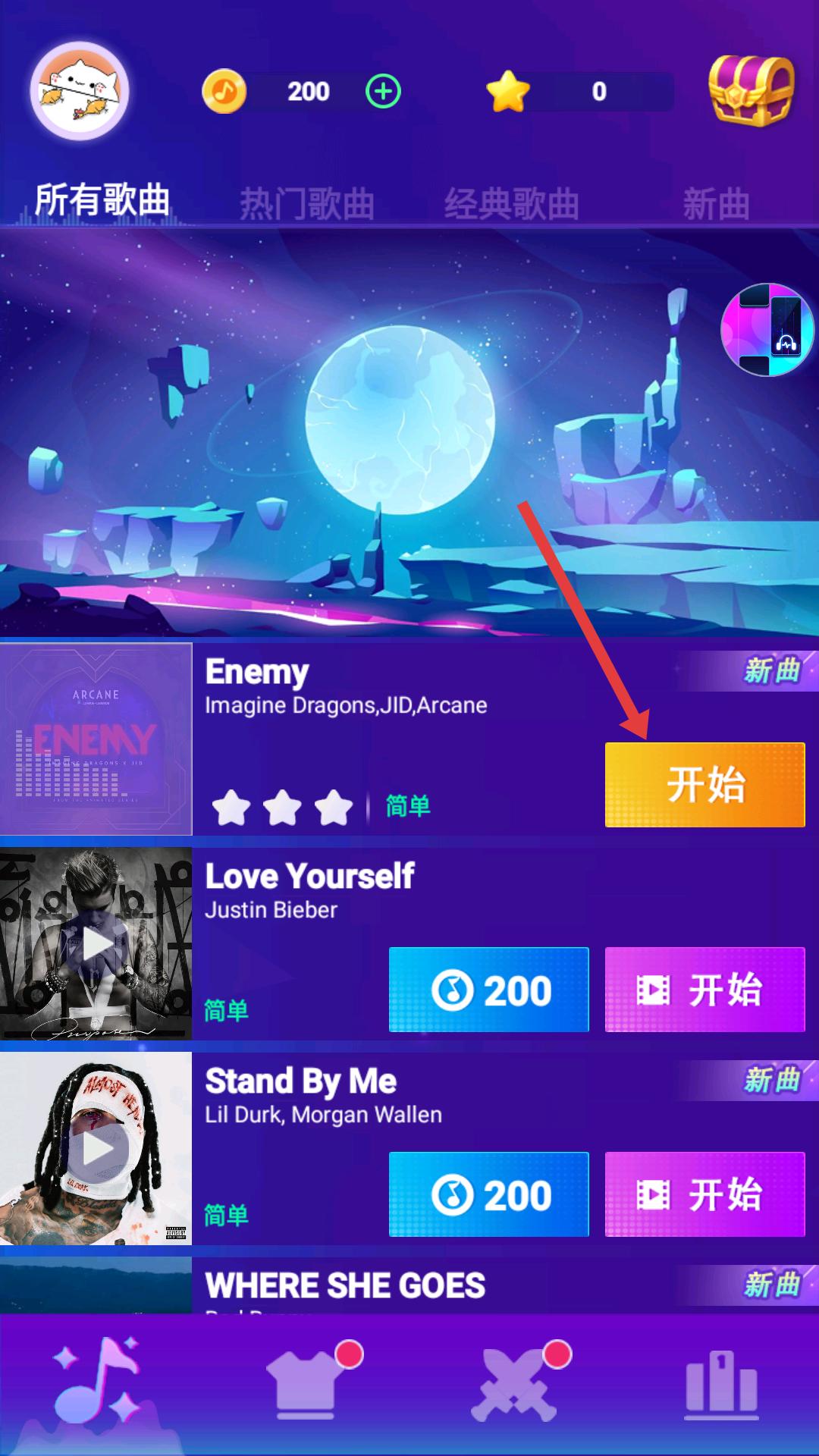 1、游戲選曲界面有不同歌曲選項,選喜歡的歌曲,點右側(cè)【開始】按鈕,可進入該歌曲演奏關(guān)卡。