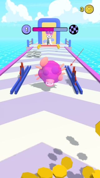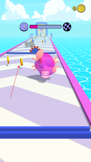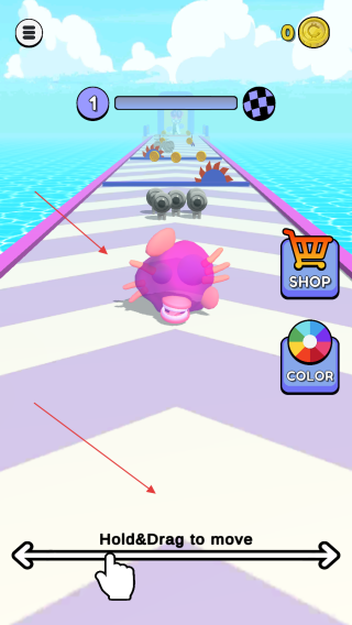 1、在游戲中通過圖標(biāo)標(biāo)記的,按住并拖動(dòng)的方式來控制粉色的器官形象在賽道上左右移動(dòng)。