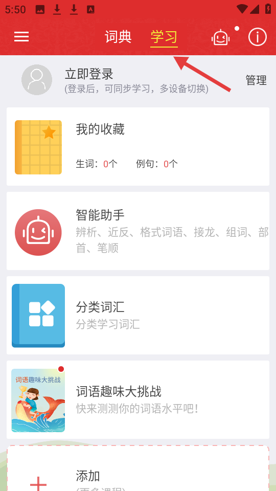 1、這是詞語(yǔ)學(xué)習(xí)類(lèi)應(yīng)用的學(xué)習(xí)界面,上方有立即登錄提示,登錄后可多設(shè)備同步還設(shè)有我的收藏等功能入口。