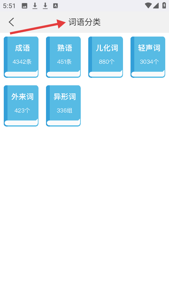 2、此為應(yīng)用內(nèi)詞語(yǔ)分類(lèi)頁(yè)面,展示了成語(yǔ)熟語(yǔ)等多種詞語(yǔ)類(lèi)別,標(biāo)注了各自數(shù)量方便有針對(duì)性學(xué)習(xí)。