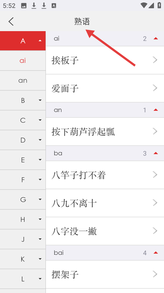 3、該圖呈現(xiàn)應(yīng)用中熟語(yǔ)部分以拼音順序排列,如挨板子愛(ài)面子等,可助力系統(tǒng)學(xué)習(xí)熟語(yǔ)知識(shí)。