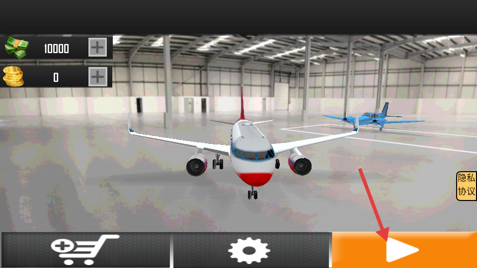 1、打開(kāi)環(huán)球旅行模擬器,映入眼簾的是機(jī)庫(kù)場(chǎng)景,能看到不同的飛機(jī),左上角顯示著游戲貨幣數(shù),點(diǎn)擊右下角橙色的播放按鈕即可進(jìn)入下一步。